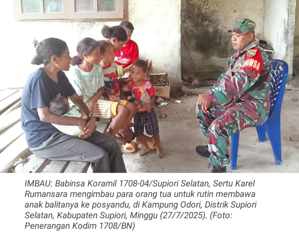 TOP-NEWS.id, SUPIORI – Upaya meningkatkan kesadaran masyarakat terhadap pentingnya kesehatan anak, Babinsa Koramil 1708-04/Supiori Selatan, Sertu Karel Rumansara mengimbau para orang tua untuk rutin membawa anak balitanya ke posyandu.
