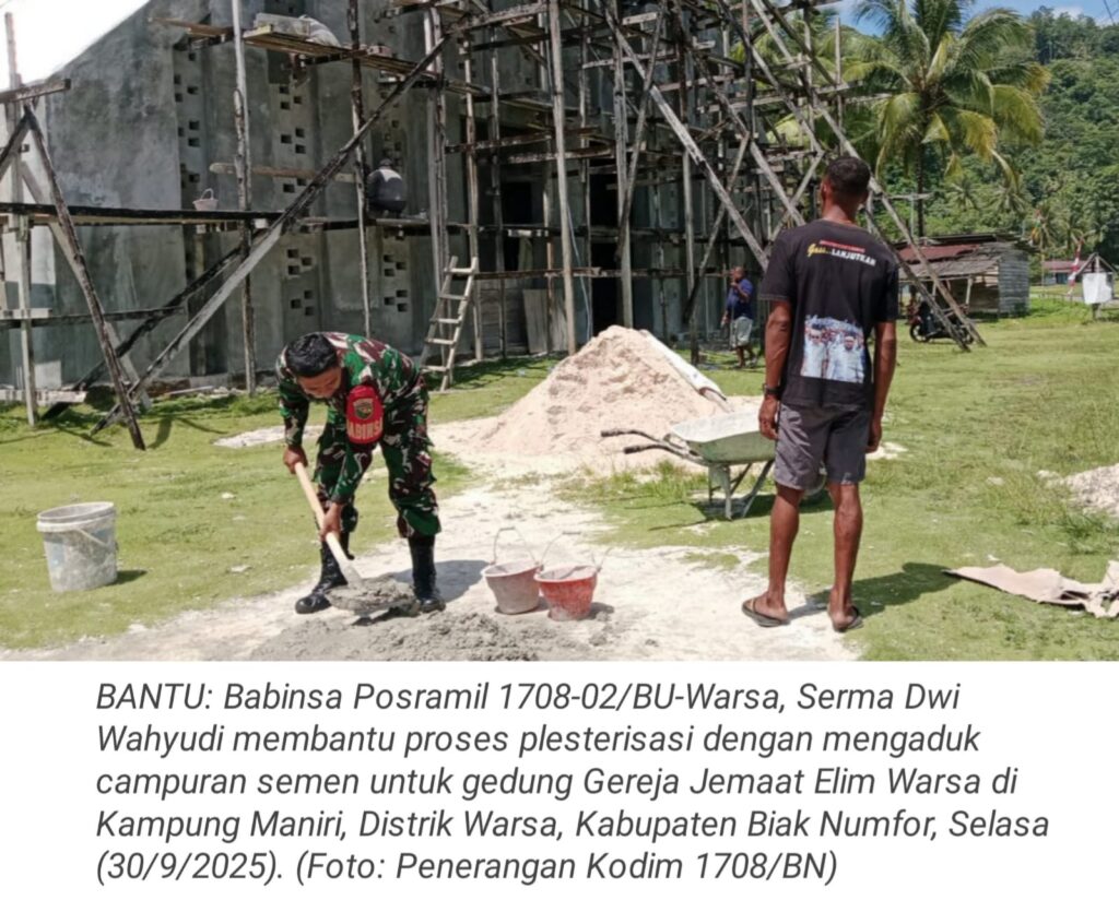 TOP-NEWS.id, WARSA – Wujud kepedulian dan bentuk nyata kemanunggalan TNI dengan rakyat, Babinsa Posramil 1708-02/BU-Warsa, Serma Dwi Wahyudi membantu proses plesterisasi gedung Gereja Jemaat Elim Warsa di Kampung Maniri, Distrik Warsa, Kabupaten Biak Numfor, Papua, Selasa (30/9/2025).