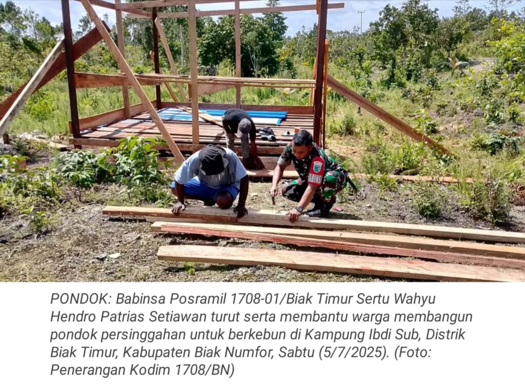TOP-NEWS.id, BIAK TIMUR – Bentuk kepedulian TNI kepada masyarakat terus ditunjukkan melalui aksi nyata di lapangan. Salah satunya seperti yang dilakukan oleh Babinsa Posramil 1708-01/Biak Timur, Sertu Wahyu Hendro Patrias Setiawan, yang turut membantu warga membangun pondok persinggahan untuk berkebun di Kampung Ibdi Sub, Distrik Biak Timur, Kabupaten Biak Numfor, Papua, Sabtu (5/7/2025).