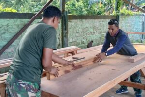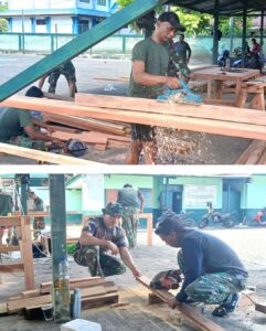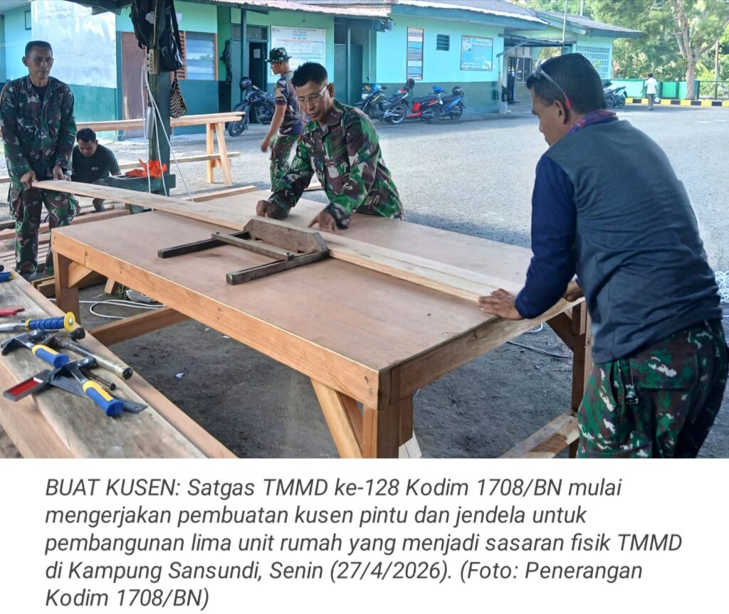 TOP-NEWS.id, BIAKSatgas TMMD ke-128 Kodim 1708/BN mulai mengerjakan pembuatan kusen pintu dan jendela untuk pembangunan lima unit rumah yang menjadi sasaran fisik TMMD di Kampung Sansundi. Pekerjaan tersebut, dilaksanakan di Makoramil 1708/BN, Jalan Sriwijaya, Distrik Samofa, Kabupaten Biak Numfor, Papua, Senin (27/4/2026).