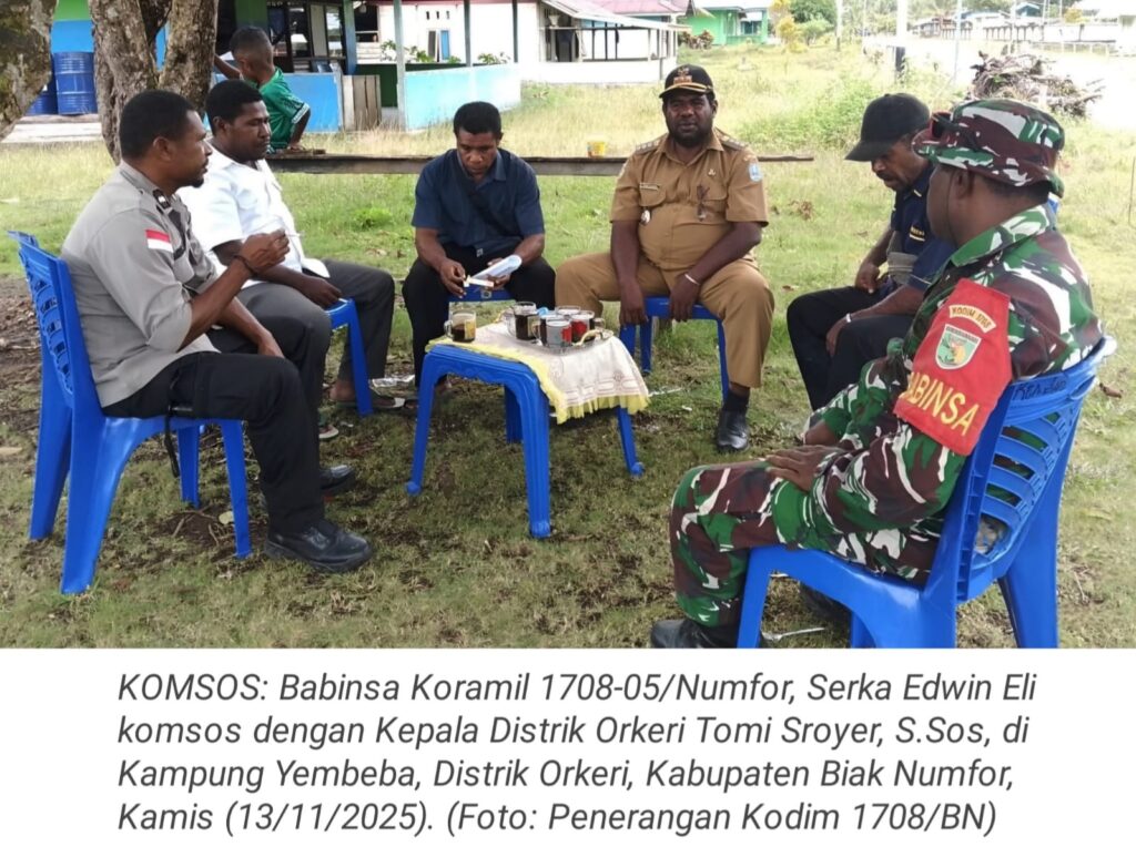 TOP-NEWS.id, NUMFOR – Upaya mempererat hubungan kerja dan menjaga sinergi di wilayah binaan, Babinsa Koramil 1708-05/Numfor, Serka Edwin Eli bersama Bhabinkamtibmas Aipda Zakeus Rumbrawer melaksanakan kegiatan komunikasi sosial (komsos) dengan Kepala Distrik Orkeri Tomi Sroyer, S.Sos. Kegiatan ini berlangsung di Kampung Yembeba, Distrik Orkeri, Kabupaten Biak Numfor, Papua, Kamis (13/11/2025).