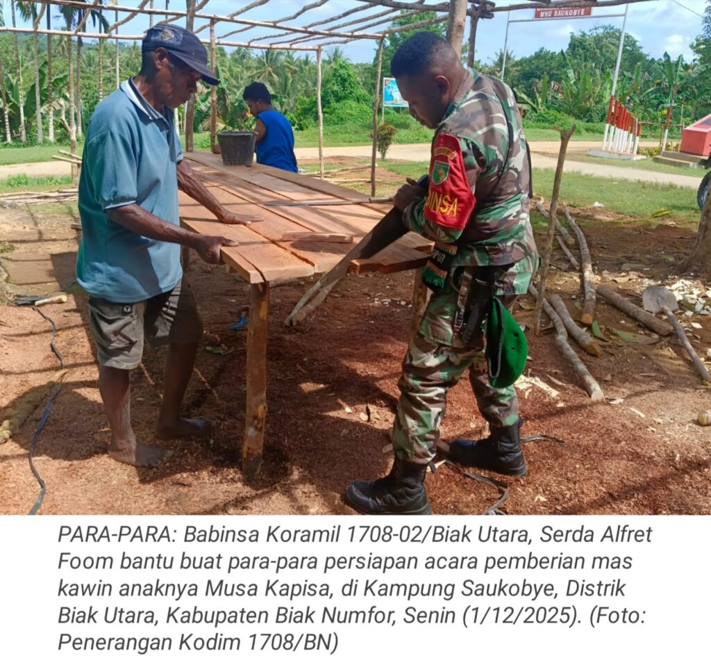 TOP-NEWS.id, BIAK UTARA – Babinsa Koramil 1708-02/Biak Utara, Serda Alfret Foom membantu warga binaannya dalam pembuatan para-para untuk persiapan acara pemberian mas kawin anaknya Musa Kapisa, di Kampung Saukobye, Distrik Biak Utara, Kabupaten Biak Numfor, Papua, Senin (1/12/2025).