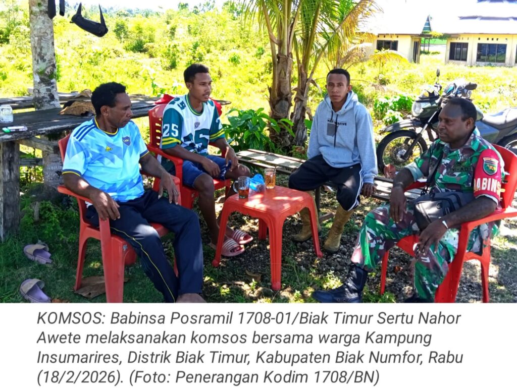 TOP-NEWD.id, BIAK TIMURBabinsa Posramil 1708-01/Biak Timur Sertu Nahor Awete melaksanakan komunikasi sosial (komsos) bersama warga di Kampung Insumarires, Distrik Biak Timur, Kabupaten Biak Numfor, Papua, Rabu (18/02/2026).
