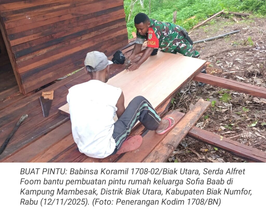 TOP-NEWS.id, BIAK UTARA – Kepedulian terhadap warga binaan kembali ditunjukkan oleh Babinsa Koramil 1708-02/Biak Utara, Serda Alfret Foom. Kali ini, ia turut membantu proses pembangunan rumah milik warga di Kampung Mambesak, Distrik Biak Utara, Kabupaten Biak Numfor, Papua, Rabu (12/11/2025).