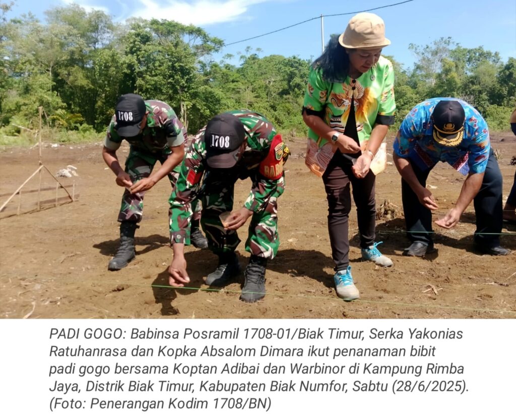 TOP-NEWS.id, BIAK TIMUR – Upaya meningkatkan ketahanan pangan terus dilakukan Babinsa di wilayah Kabupaten Biak Numfor. Seperti yang dilakukan Babinsa Posramil 1708-01/Biak Timur, Serka Yakonias Ratuhanrasa dan Kopka Absalom Dimara mendampingi penanaman bibit padi gogo bersama Kelompok Tani (Koptan) Adibai dan Warbinor di Kampung Rimba Jaya, Distrik Biak Timur, Kabupaten Biak Numfor, Papua, Sabtu (28/6/2025).