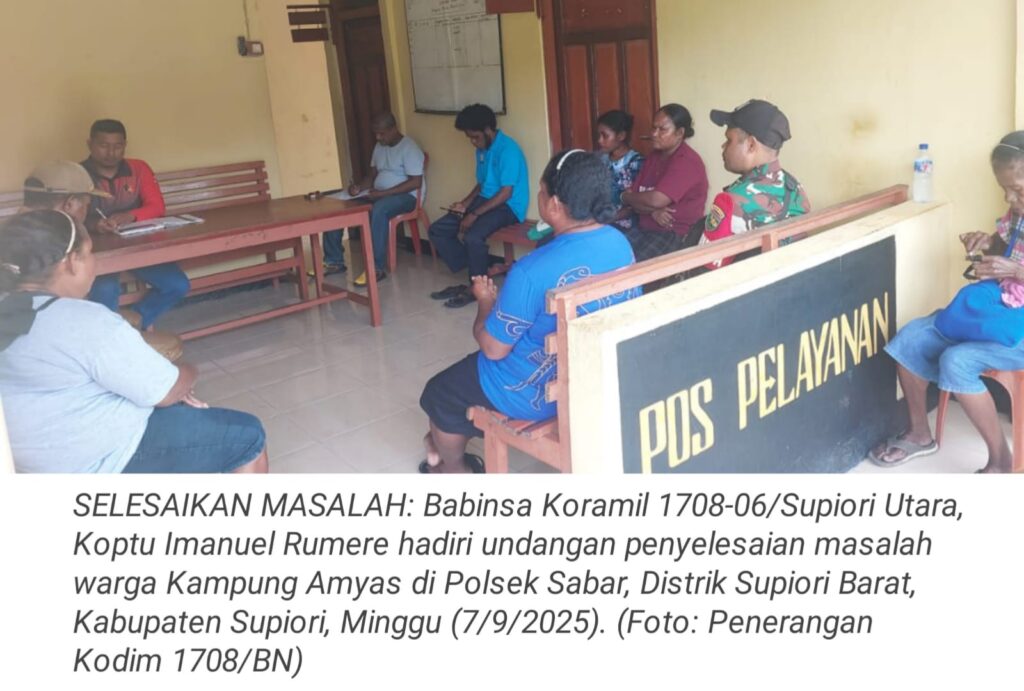 TOP-NEWS.id, SUPIORI – Babinsa Koramil 1708-06/Supiori Utara, Koptu Imanuel Rumere menghadiri undangan penyelesaian masalah warga Kampung Amyas yang dilaksanakan di Polsek Sabar, Distrik Supiori Barat, Kabupaten Supiori, Papua, Minggu (7/9/2025).