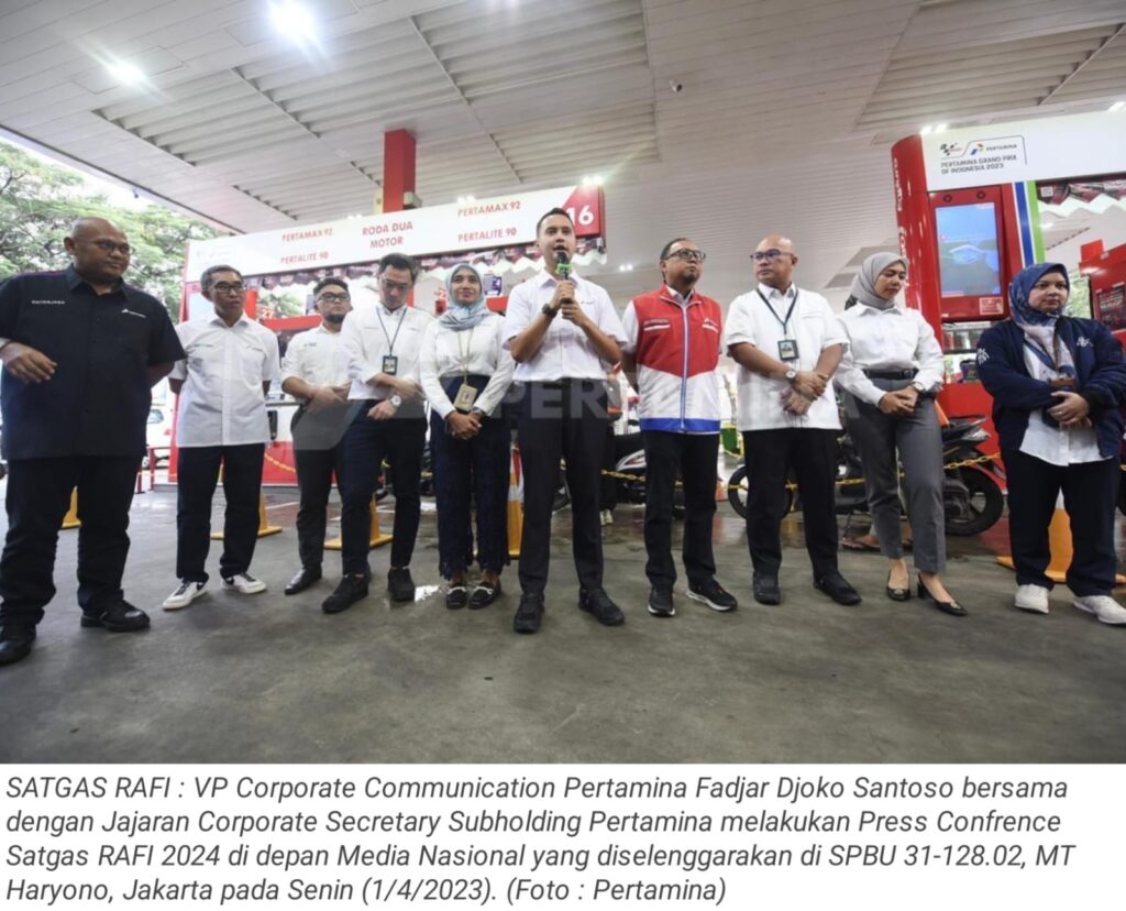 Kesiapan tersebut disampaikan Vice President Corporate Communication PT Pertamina (Persero), Fadjar Djoko Santoso kepada media di SPBU Pertamina 31.128.02. M.T Haryono, Jakarta Selatan, Senin 1 April 2024. Menurutnya, sesuai fokus Satgas RAFI 2024, periode 1 April – 21 April, Pertamina menyediakan layanan tambahan di wilayah jalur mudik, daerah wisata, daerah rawan banjir dan daerah rawan bencana.