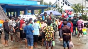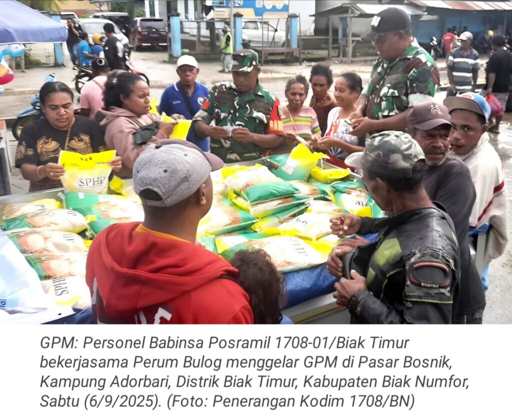 TOP-NEWS.id, BIAK TIMUR – Upaya mendukung ketahanan pangan (hanpangan) dan membantu meringankan beban masyarakat, personel Babinsa Posramil 1708-01/Biak Timur, yang dipimpin Danposramil Serka Novan Irio bekerjasama dengan Perum Bulog menggelar Gerakan Pangan Murah (GPM) di Pasar Bosnik, Kampung Adorbari, Distrik Biak Timur, Kabupaten Biak Numfor, Papua, Sabtu (6/9/2025).