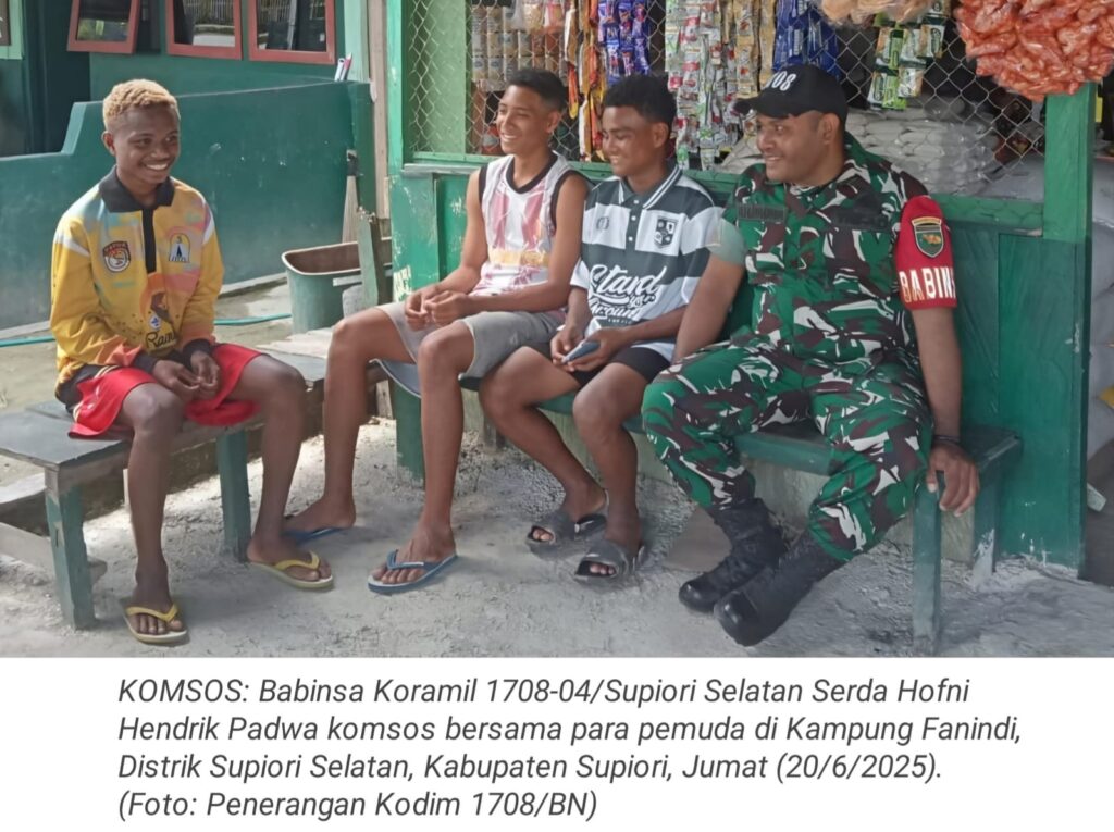 TOP-NEWS.id, SUPIORI – Upaya menjaga hubungan yang harmonis antara TNI dan masyarakat, Babinsa Koramil 1708-04/Supiori Selatan, Serda Hofni Hendrik Padwa melaksanakan kegiatan komunikasi sosial (komsos) bersama para pemuda Kampung Fanindi, Distrik Supiori Selatan, Kabupaten Supiori, Papua, Jumat (20/6/2025).