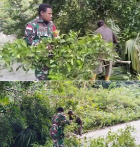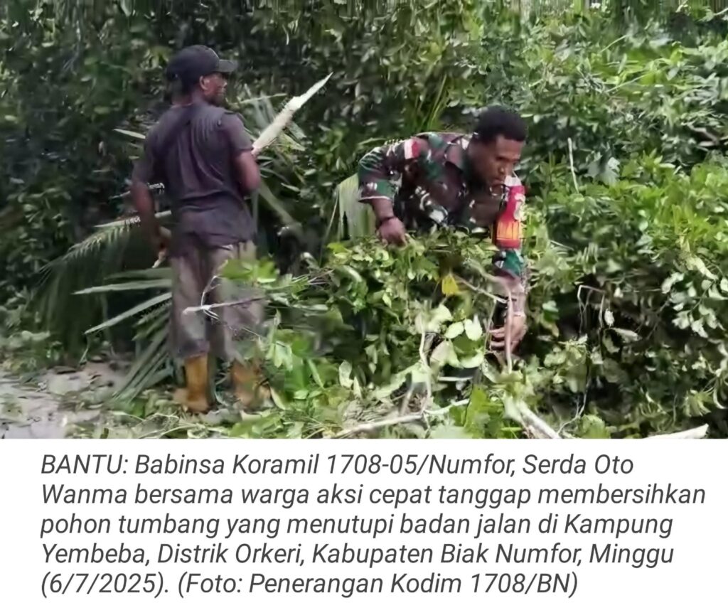 TOP-NEWA.id, NUMFOR – Sebagai wujud tanggung jawab dan kepedulian terhadap masyarakat, Babinsa Koramil 1708-05/Numfor, Serda Oto Wanma bersama warga melaksanakan aksi cepat tanggap membersihkan pohon tumbang yang menutupi badan jalan di Kampung Yembeba, Distrik Orkeri, Kabupaten Biak Numfor, Papua, Minggu (6/7/2025).