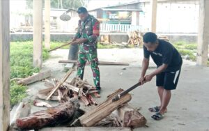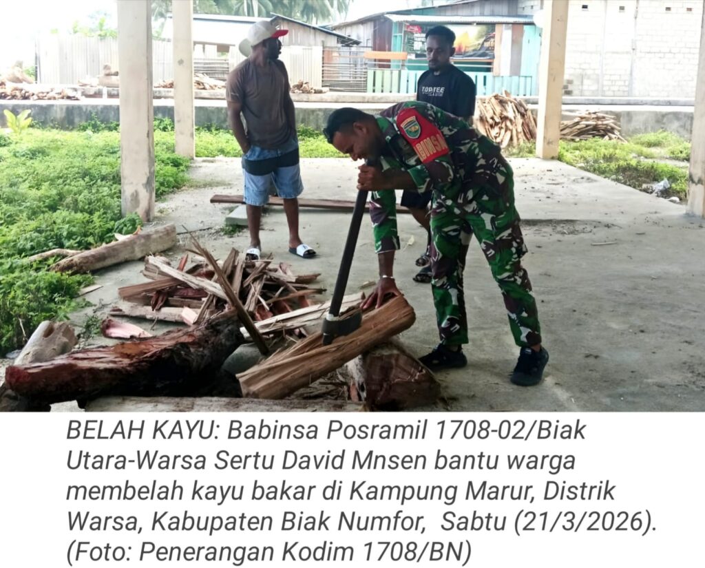 TOP-NEWS.id, WARSA – Kepedulian terhadap warga binaan terus ditunjukkan Babinsa Posramil 1708-02/Biak Utara-Warsa, Sertu David Mnsen membantu masyarakat membelah kayu bakar di Kampung Marur, Distrik Warsa, Kabupaten Biak Numfor, Papua, Sabtu (21/3/2026).