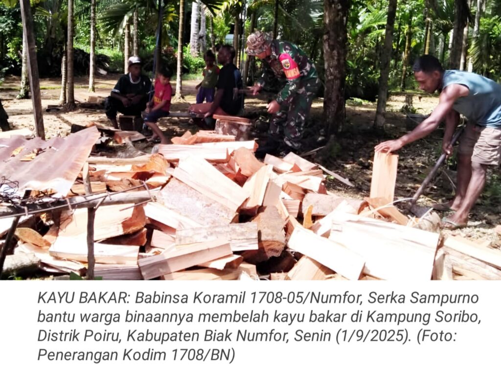 TOP-NEWS.id, NUMFOR – Babinsa Koramil 1708-05/Numfor, Serka Sampurno bantu warga membelah kayu bakar untuk kebutuhan dapur di Kampung Soribo, Distrik Poiru, Kabupaten Biak Numfor, Papua, Senin (1/9/2025).