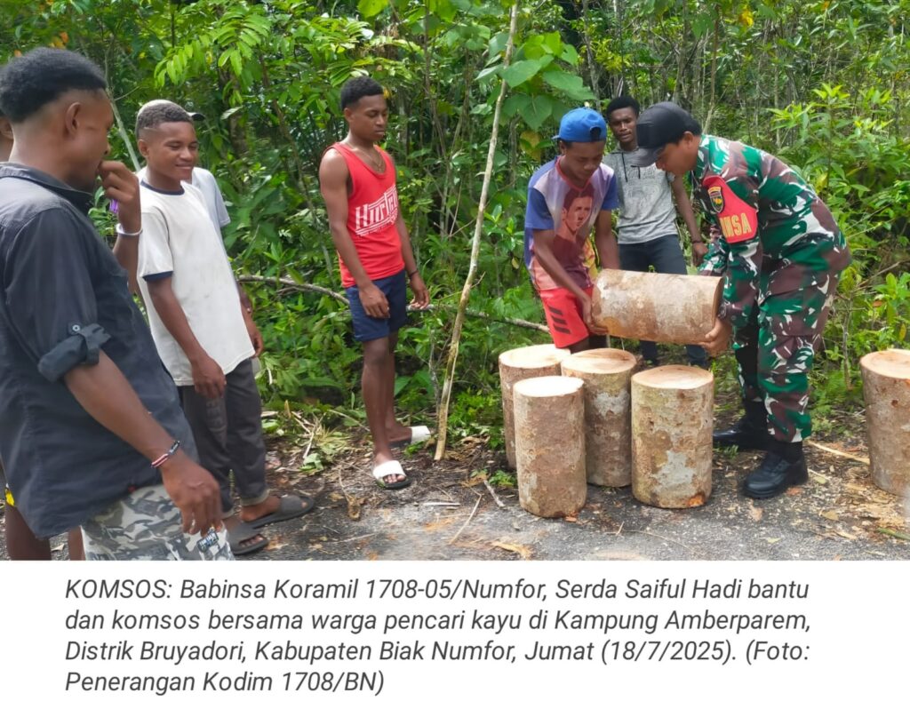 TOP-NEWS.id, NUMFOR – Dalam upaya mempererat hubungan dengan masyarakat dan memastikan wilayah tetap aman dan kondusif, Babinsa Koramil 1708-05/Numfor, Serda Saiful Hadi melaksanakan kegiatan komunikasi sosial (komsos) dengan warga yang sedang mencari kayu di Kampung Amberparem, Distrik Bruyadori, Kabupaten Biak Numfor, Papua, Jumat (18/7/2025).