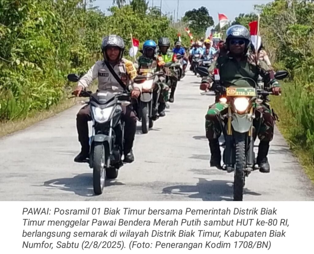 TOP-NEWS.id, BIAK TIMUR – Menyambut Hari Ulang Tahun (HUT) ke-80 Republik Indonesia (RI), Posramil 01 Biak Timur bersama Pemerintah Distrik Biak Timur menggelar Pawai Bendera Merah Putih yang berlangsung semarak di wilayah Distrik Biak Timur, Kabupaten Biak Numfor, Papua, Sabtu (2/8/2025).