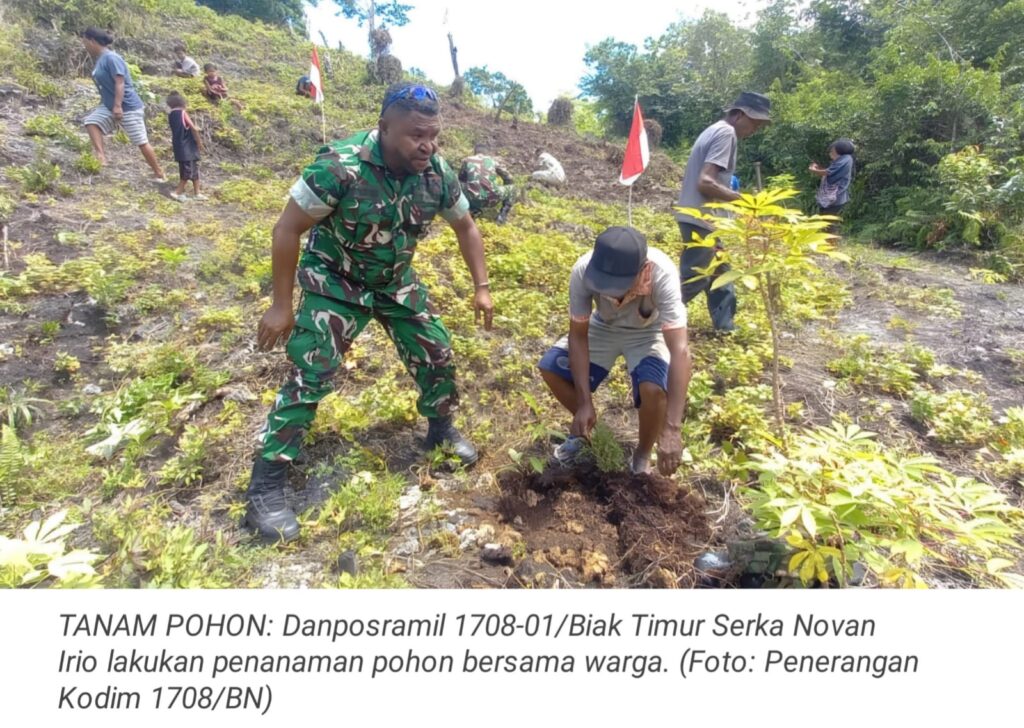 TOP-NEWS.id, BIAK TIMUR – Menyambut Hari Ulang Tahun (HUT) ke-80 Kemerdekaan Republik Indonesia (RI), personel Posramil 1708-01/Biak Timur, yang dipimpin Danposramil Serka Novan Irio bersama masyarakat dan pemuda Kampung Yenusi melaksanakan kegiatan penanaman pohon di Kampung Yenusi, Distrik Biak Timur, Kabupaten Biak Numfor, Provinsi Papua, Selasa (12/8/2025).