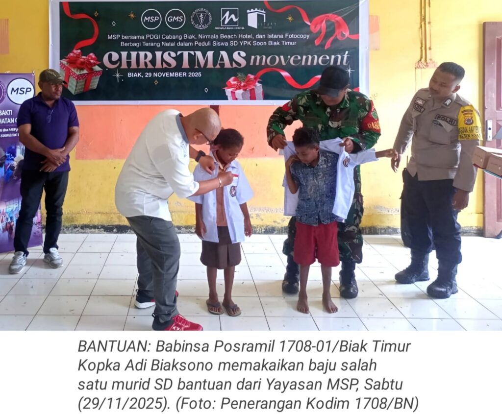TOP-NEWS.id, BIAK TIMUR – Babinsa Posramil 1708-01/Biak Timur Kopka Adi Biaksono menghadiri kegiatan bakti sosial yang digelar oleh Yayasan Mawar Sharon Peduli (MSP) di SD YPK Soon, Distrik Biak Timur, Kabupaten Biak Numfor, Papua,Sabtu (29/11/2025).