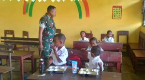 Sehatkan Anak Negeri, Babinsa Biak Timur Dampingi Pembagian Makanan Bergizi Gratis