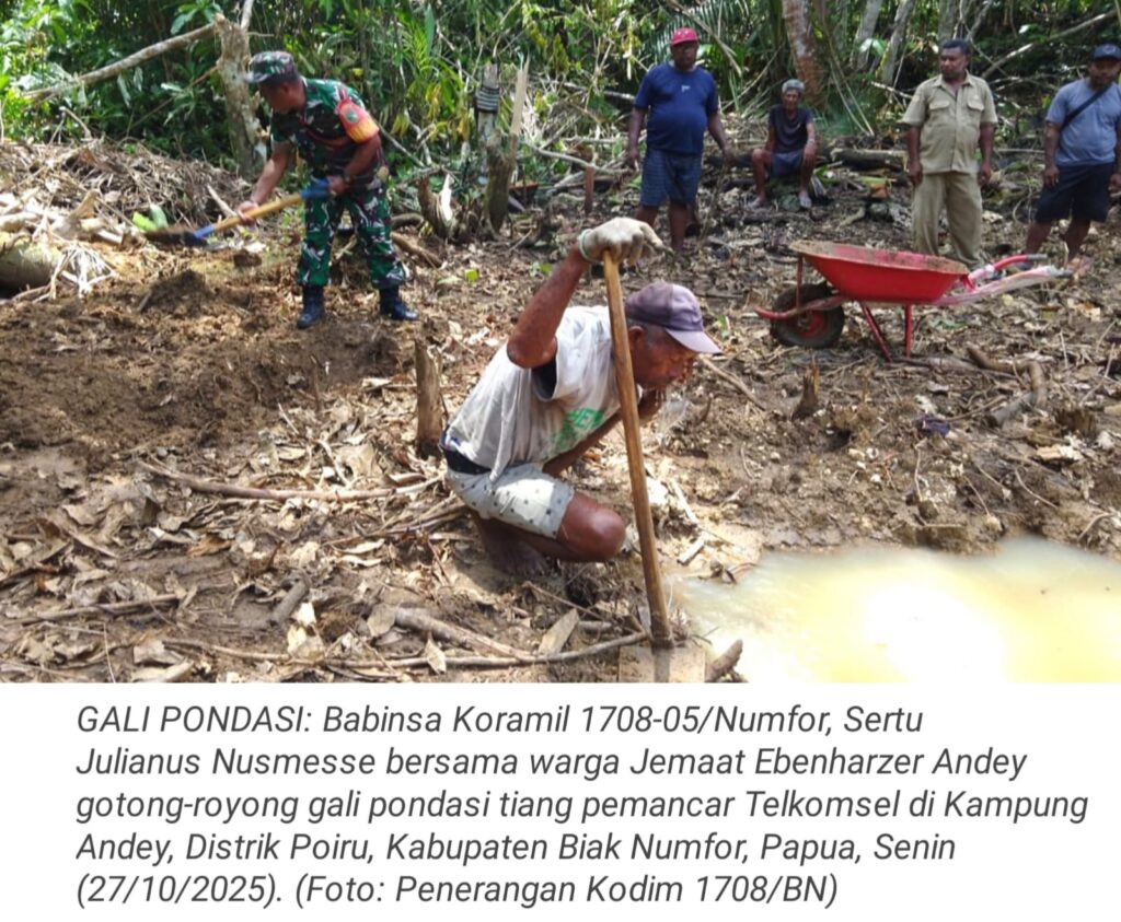 TOP-NEWS.id, NUMFOR – Babinsa Koramil 1708-05/Numfor, Sertu Julianus Nusmesse bersama warga Jemaat Ebenharzer Andey melaksanakan kegiatan gotong-royong penggalian pondasi tiang pemancar Telkomsel di Kampung Andey, Distrik Poiru, Kabupaten Biak Numfor, Papua, Senin (27/10/2025).