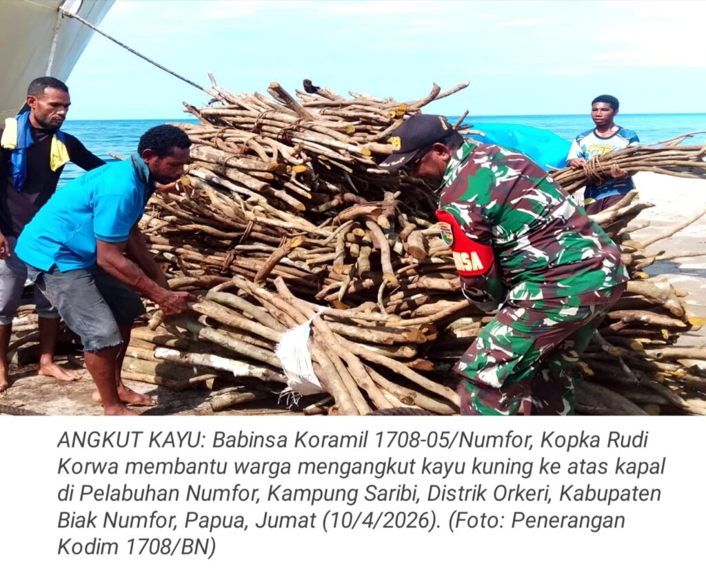 TOP-NEWS.id, NUMFOR – Kepedulian terhadap masyarakat kembali ditunjukkan Babinsa Koramil 1708-05/Numfor, Kopka Rudi Korwa, yang turun langsung membantu warga mengangkut kayu kuning ke atas kapal di Pelabuhan Numfor, Kampung Saribi, Distrik Orkeri, Kabupaten Biak Numfor, Papua, Jumat (10/4/2026).