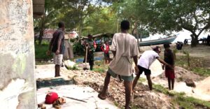 Kegiatan renovasi diawali dengan menghancurkan atau membongkar lantai gereja yang sudah rusak untuk dilakukan pengecoran ulang. Babinsa bersama masyarakat bekerja bahu-membahu membongkar bagian lantai menggunakan alat seadanya.