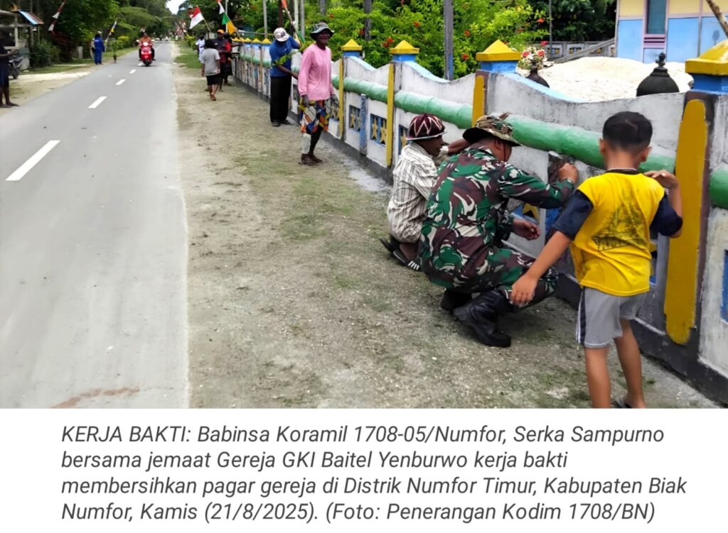 TOP-NEWS.id, NUMFOR – Babinsa Koramil 1708-05/Numfor, Serka Sampurno kembali menunjukkan kepeduliannya terhadap lingkungan masyarakat binaan. Kali ini, ia bersama jemaat Gereja GKI Baitel Yenburwo melaksanakan kegiatan kerja bakti membersihkan pagar gereja yang berada di Distrik Numfor Timur, Kabupaten Biak Numfor, Papua, Kamis (21/8/2025).