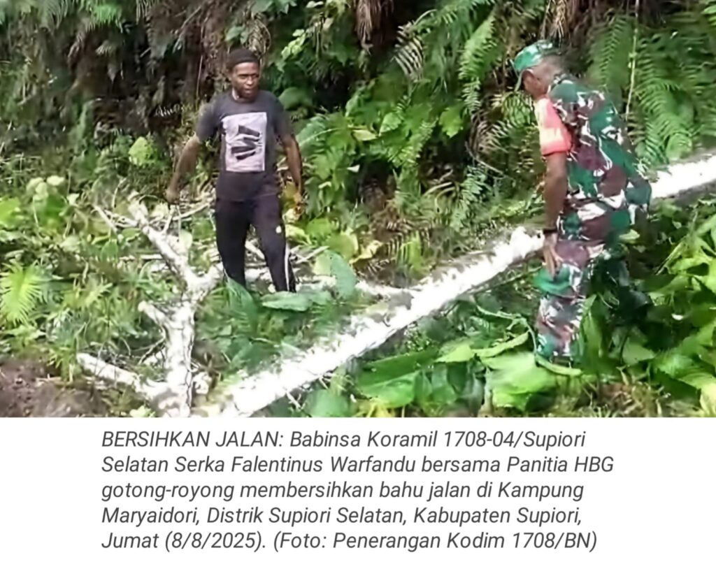 TOP-NEWS.id, SUPIORI – Menjaga kebersihan lingkungan sekaligus menciptakan kenyamanan bagi pengguna jalan, Babinsa Koramil 1708-04/Supiori Selatan Serka Falentinus Warfandu bersama Panitia Hari-Hari Besar Gereja (HBG) menggelar kegiatan gotong-royong membersihkan bahu jalan di Kampung Maryaidori, Distrik Supiori Selatan, Kabupaten Supiori, Papua, Jumat (8/8/2025).