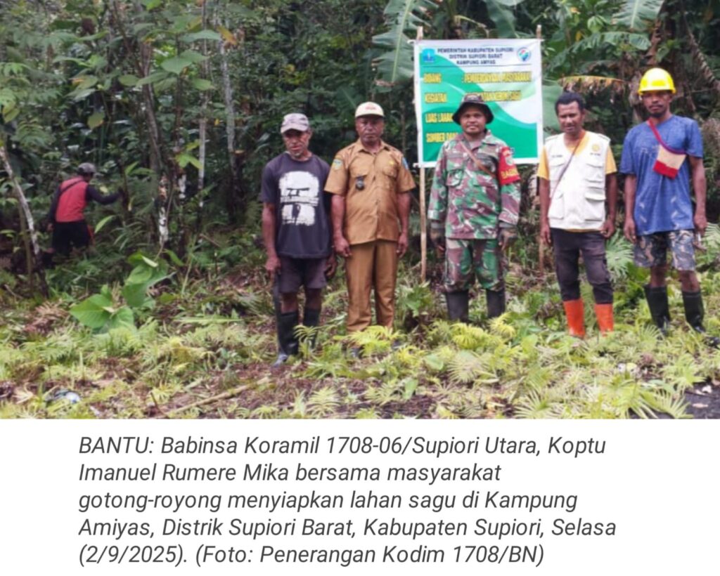 TOP-NEWS.id, SUPIORI – Dalam rangka mendukung ketahanan pangan (hanpangan) lokal dan menjaga kearifan budaya daerah, Babinsa Koramil 1708-06/Supiori Utara, Koptu Imanuel Rumere Mika bersama masyarakat melaksanakan kegiatan gotong-royong menyiapkan lahan sagu di Kampung Amiyas, Distrik Supiori Barat, Kabupaten Supiori, Papua, Selasa (2/9/2025).