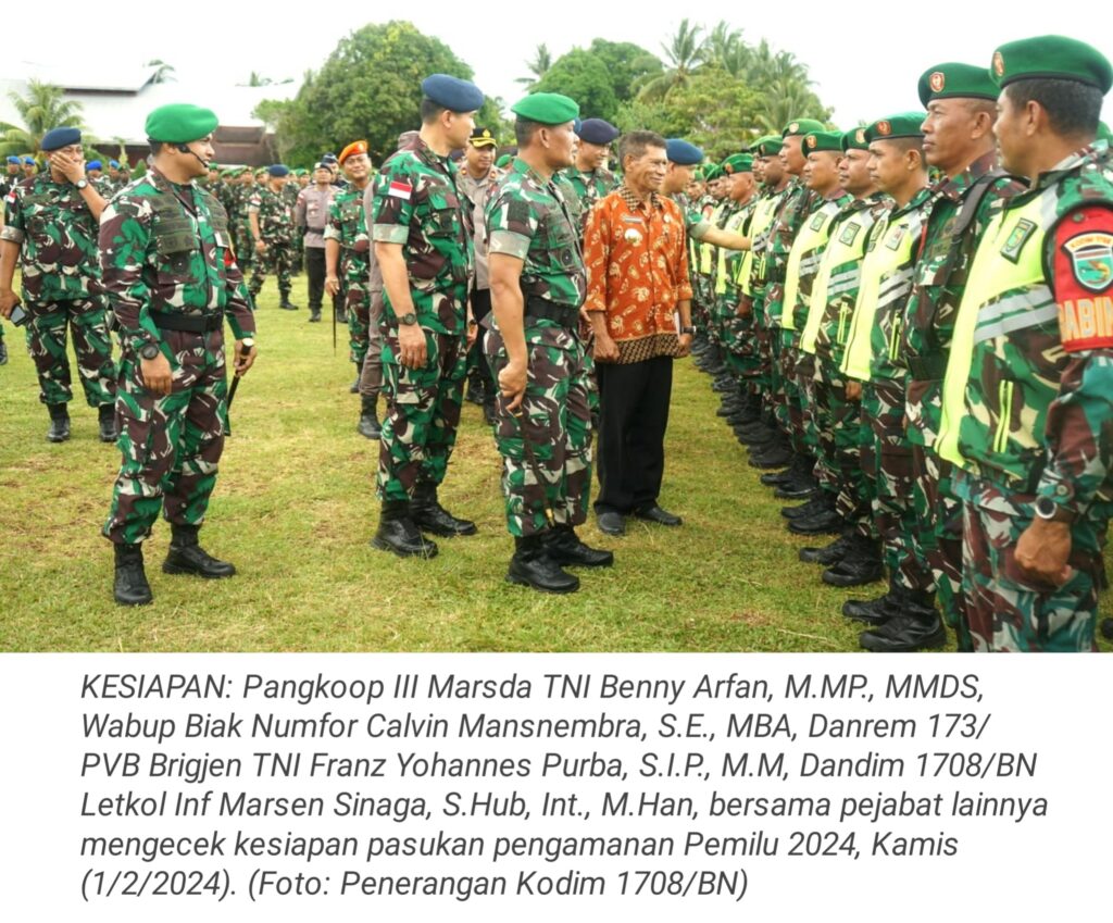 TOP-NEWS.id, BIAK – Dandim 1708/BN Letkol Inf Marsen Sinaga, S.Hub, Int., M.Han menjadi Komandan Upacara pada apel gelar pasukan sebagai persiapan menghadapi pengamanan Pemilu 2024. Apel tersebut dipusatkan di Lapangan Cenderawasih, Jalan Sisimangaraja, Distrik Biak Kota, Kabupaten Biak Numfor, Provinsi Papua, Kamis (1/2/2024).