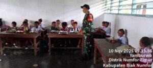 TOP-NEWS.id, NUMFOR – Babinsa Koramil 1708-05/Numfor Serda Angga Airlangga mendampingi pelaksanaan Program Makanan Bergizi Gratis (MBG) bersama Satuan Pelayanan Pemenuhan Gizi (SPPG) di SD YPK Yamburwo, Desa Yemburwo, Distrik Numfor Timur, Kabupaten Biak Numfor, Papua, Senin (10/11/2025).