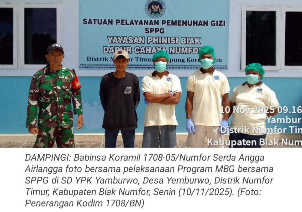 TOP-NEWS.id, NUMFOR – Babinsa Koramil 1708-05/Numfor Serda Angga Airlangga mendampingi pelaksanaan Program Makanan Bergizi Gratis (MBG) bersama Satuan Pelayanan Pemenuhan Gizi (SPPG) di SD YPK Yamburwo, Desa Yemburwo, Distrik Numfor Timur, Kabupaten Biak Numfor, Papua, Senin (10/11/2025).