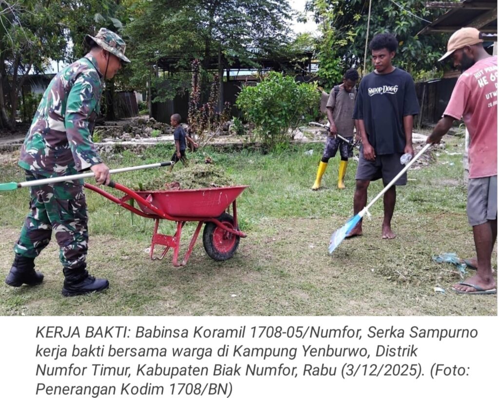 TOP-NEWS.id, NUMFORBabinsa Koramil 1708-05/Numfor, Serka Sampurno turun tangan melaksanakan kerja bakti bersama warga di Kampung Yenburwo, Distrik Numfor Timur, Kabupaten Biak Numfor, Papua, Rabu (3/12/2025).
