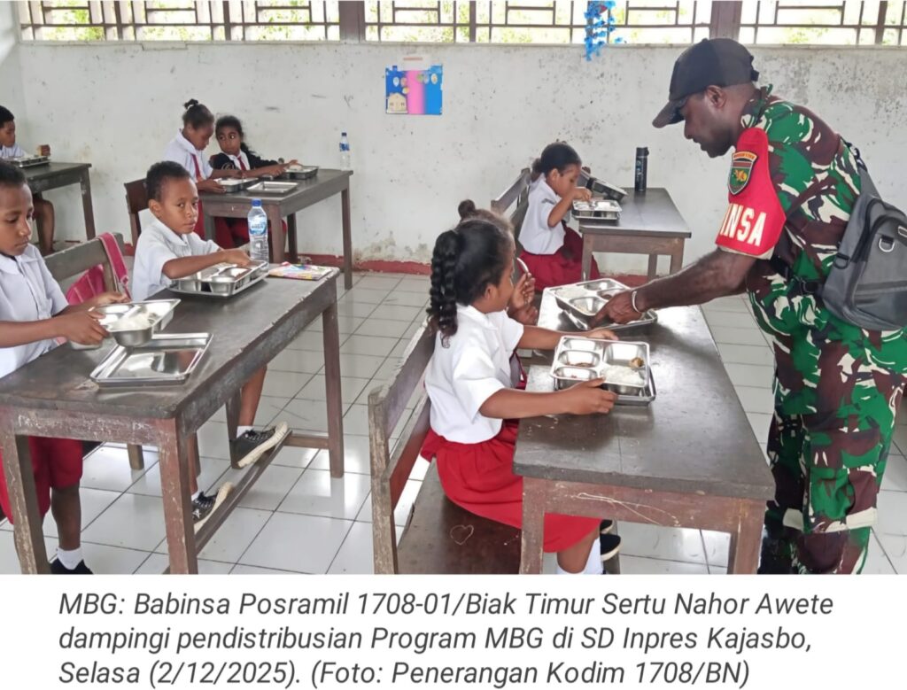 TOP-NEWS.id, BIAK TIMUR – Dalam rangka mendukung program pemerintah terkait Makan Bergizi Gratis (MBG) untuk anak usia sekolah, personel Babinsa Posramil 1708-01/Biak Timur terus menunjukkan komitmennya turun langsung mendampingi pendistribusian makanan bergizi ke sejumlah sekolah di wilayah Distrik Biak Timur, Kabupaten Biak Numfor, Papua, Selasa (2/12/2025).