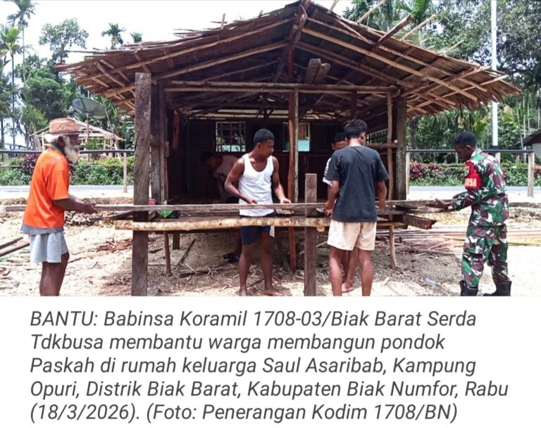 TOP-NEWS.id, BIAK BARAT - Babinsa Koramil 1708-03/Biak Barat Serka Yairus Arwam membantu warga membuat pondok Paskah di halaman rumah keluarga...