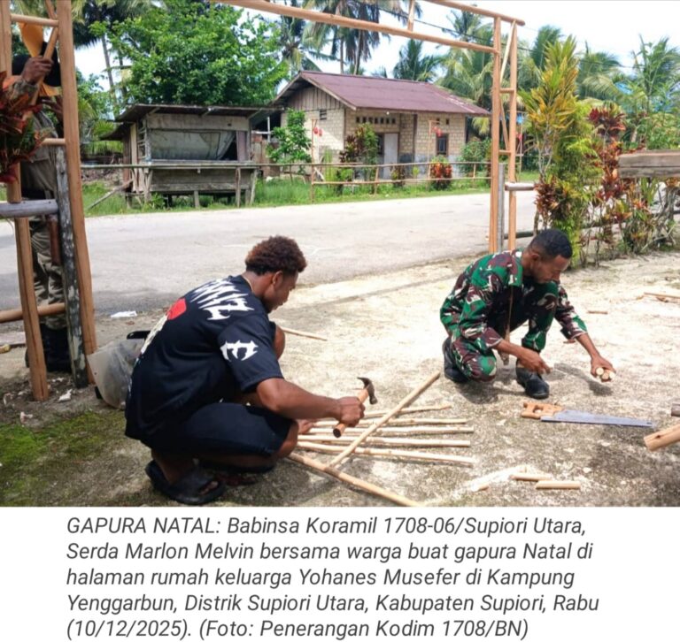 TOP-NEWS.id, SUPIORI UTARA - Babinsa Koramil 1708-06/Supiori Utara, Serda Marlon Melvin bersama warga melaksanakan pembuatan gapura Natal di halaman rumah...