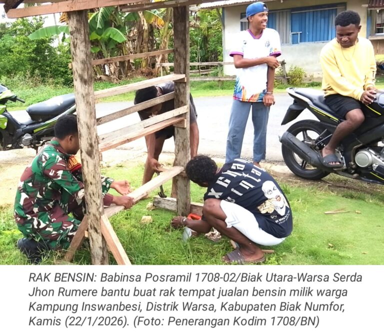 TOP-NEWS.id, WARSA - Dalam rangka membantu meringankan kesulitan warga binaan, Babinsa Posramil 1708-02/Biak Utara-Warsa Serda Jhon Rumere membantu pembuatan rak...
