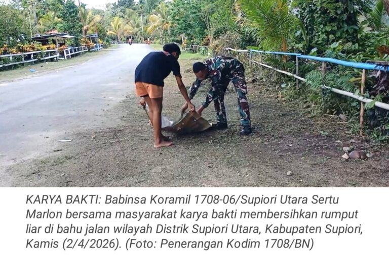 TOP-NEWS.id, SUPIORI UTARA - Babinsa Koramil 1708-06/Supiori Utara, Sertu Marlon bersama masyarakat melaksanakan karya bakti membersihkan rumput liar di bahu...