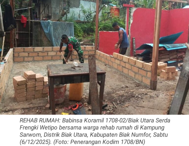 TOP-NEWS.id, BIAK UTARA - Babinsa Koramil 1708-02/Biak Utara Serda Frengki Wetipo bersama warga melaksanakan kegiatan perehaban rumah di Kampung Sarwom,...