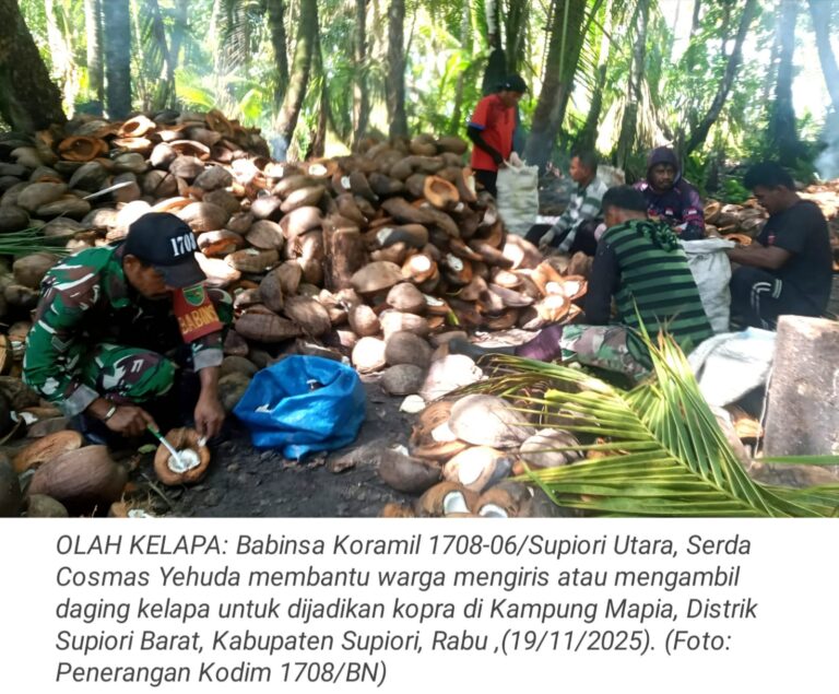 TOP-NEWS.id, SUPIORI - Babinsa Koramil 1708-06/Supiori Utara, Serda Cosmas Yehuda turun langsung membantu warga mengiris atau mengambil daging kelapa untuk...