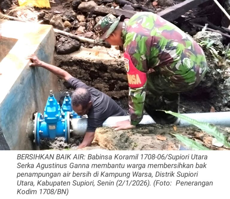 TOP-NEWS.id, SUPIORI - Babinsa Koramil 1708-06/Supiori Utara Serka Agustinus Ganna membantu warga membersihkan bak penampungan air bersih di Kampung Warsa,...