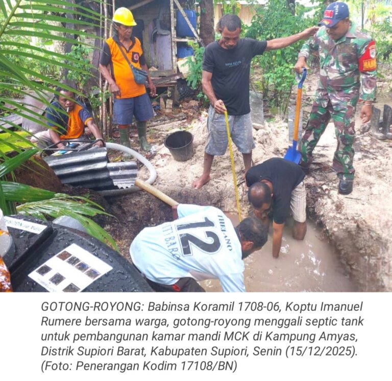 TOP-NEWS.id, SUPIORI BARAT - Babinsa Koramil 1708-06/Supiori Barat, Koptu Imanuel Rumere bersama warga melaksanakan kegiatan gotong-royong menggali septic tank untuk...