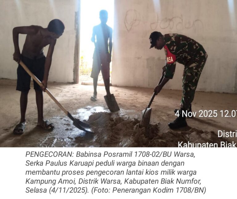 TOP-NEWS.id, WARSA - Babinsa Posramil 1708-02/BU-Warsa, Serka Paulus Karuapi menunjukkan kepeduliannya terhadap warga binaan dengan membantu proses pengecoran lantai kios...
