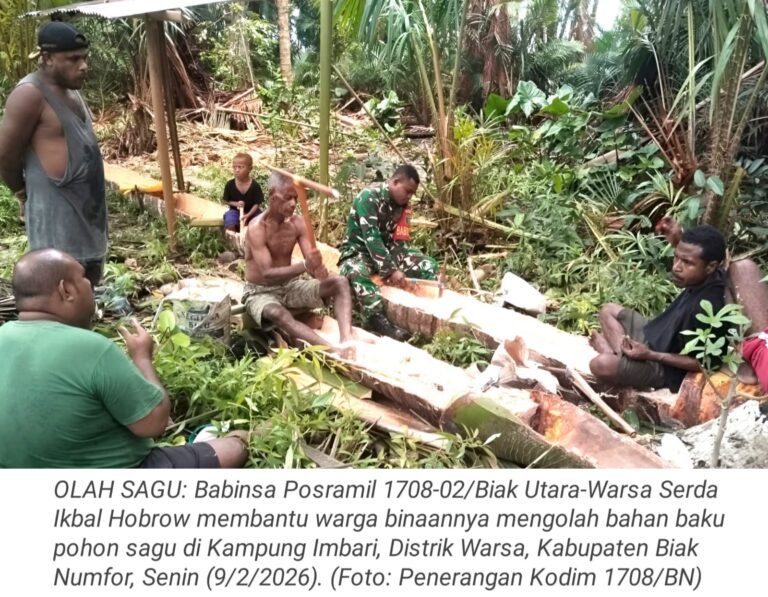 TOP-NEWS.id, WARSA - Babinsa Posramil 1708-02/Biak Utara-Warsa Serda Ikbal Hobrow membantu warga binaannya mengolah bahan baku pohon sagu menjadi bahan...