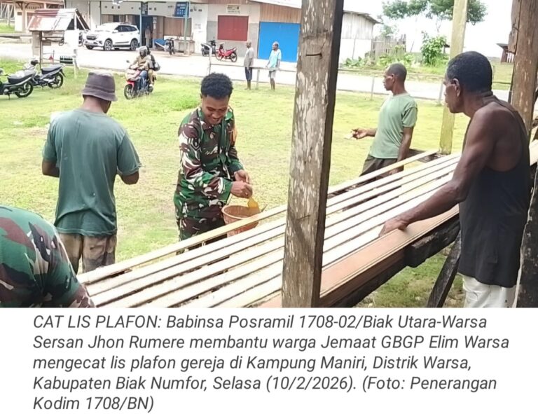 TOP-NEWS.id, WARSA - Babinsa Posramil 1708-02/Biak Utara-Warsa Sersan Jhon Rumere membantu warga Jemaat GBGP Elim Warsa mengecat lis plafon gereja...