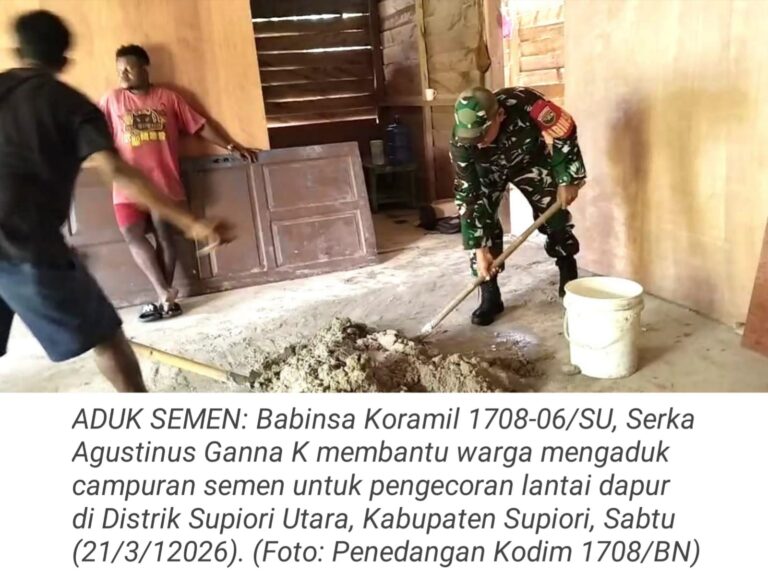 TOP-NEWS.id, SUPIORI - Babinsa Koramil 1708-06/SU, Serka Agustinus Ganna K membantu warga mengaduk campuran untuk pengecoran lantai dapur di kampung...