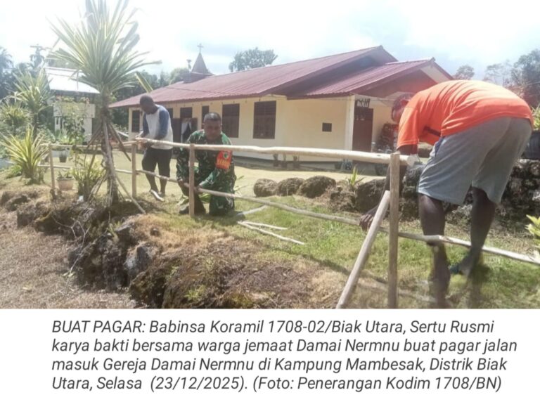 TOP-NEWS.id, BIAK UTARA - Babinsa Koramil 1708-02/Biak Utara, Sertu Rusmi karya bakti bersama warga jemaat Damai Nermnu untuk buat pagar...