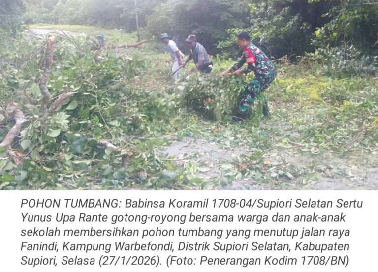 TOP-NEWS.id, SUPIORI - Babinsa Koramil 1708-04/Supiori Selatan Sertu Yunus Upa Rante melaksanakan kegiatan gotong-royong bersama warga dan anak-anak sekolah untuk...