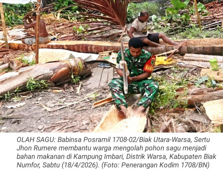 TOP-NEWS.id, WARSA - Babinsa Posramil 1708-02/Biak Utara-Warsa, Sertu Jhon Rumere membantu warga mengolah pohon sagu menjadi bahan makanan di Kampung...