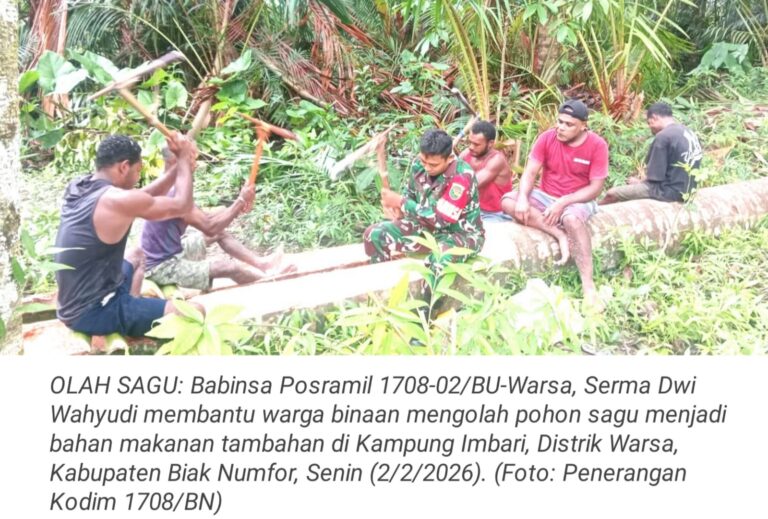 TOP-NEWS.id, WARSA - Babinsa Posramil 1708-02/BU-Warsa, Serma Dwi Wahyudi membantu warga binaan mengolah pohon sagu menjadi bahan makanan tambahan di...