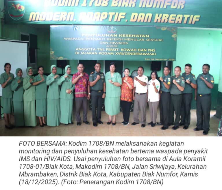 TOP-NEWS.id, BIAK - Kodim 1708/BN melaksanakan kegiatan monitoring dan penyuluhan kesehatan dengan tema waspada penyakit infeksi menular seksual (IMS) dan...