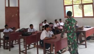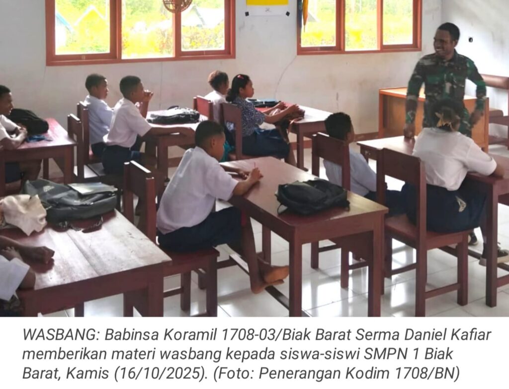 TOP-NEWS.id, BIAK BARAT – Babinsa Koramil 1708-03/Biak Barat Serma Daniel Kafiar memberikan materi wawasan kebangsaan (wasbang) kepada siswa-siswi SMPN 1 Biak Barat di Kampung Yomdori, Distrik Biak Barat, Kabupaten Biak Numfor, Papua, Kamis (16/10/2025).
